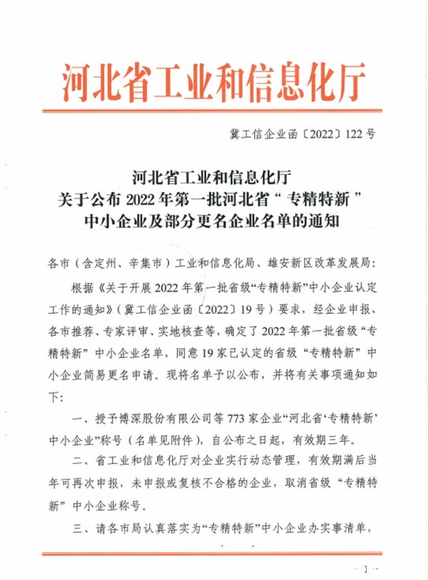 2022年3月19日,河北省工业和信息化厅公布了2022年河北省“专精特新”中小企业名单,世界杯直播平台网站被认定为“专精特新”企业。